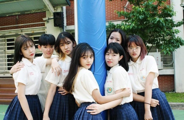 ▲穿著制服的女孩們圍繞在學校的藍色柱子前,以輕擁彼此的姿勢面對鏡頭。