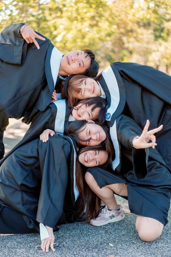 ▲身穿學士服的畢業生們,歪著頭,一個一個疊在一起。