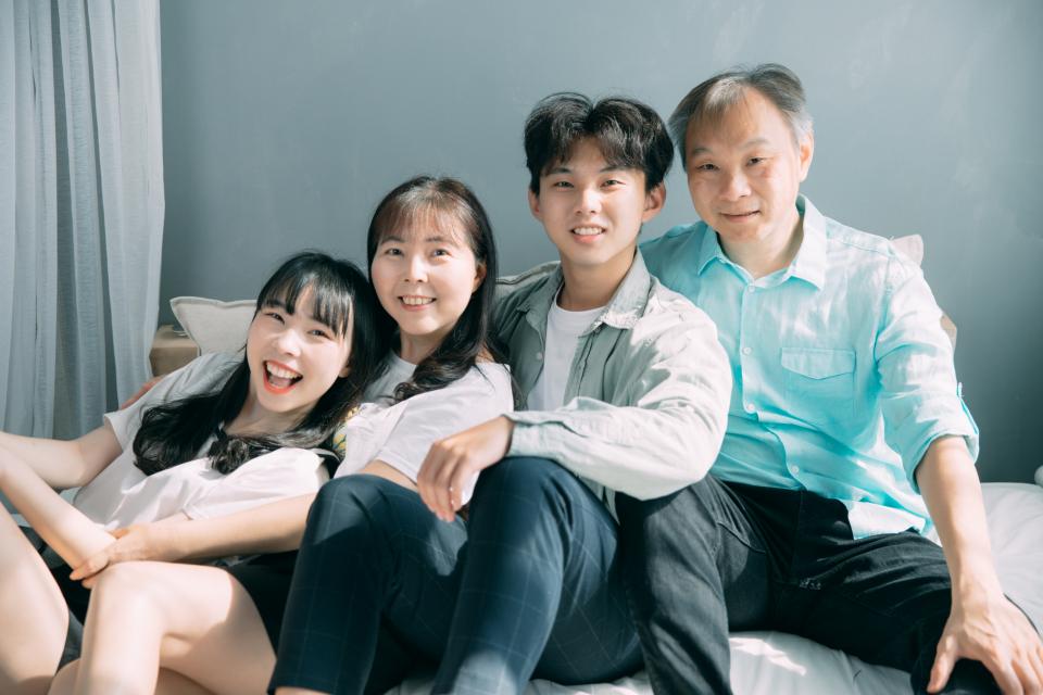 ▲一家四口坐在沙發上面互相依偎,展現親密感情。