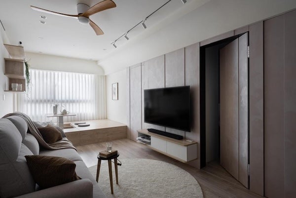 - 客廳電視牆後方:如果電視牆旁是臥室門或其他空間的門扇,透過隱藏門設計可以讓客廳看起來更寬敞完整。