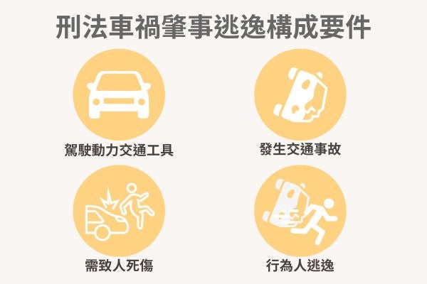 - 需致人死傷:無論輕傷、重傷或死亡,只要事故中出現人員傷亡即構成肇事逃逸罪;若只有車體損毀便不構成肇事逃逸,但還是可能違反*道路交通管理處罰條例第62條,面臨罰鍰或吊扣駕駛執照的罰責。