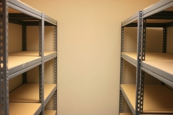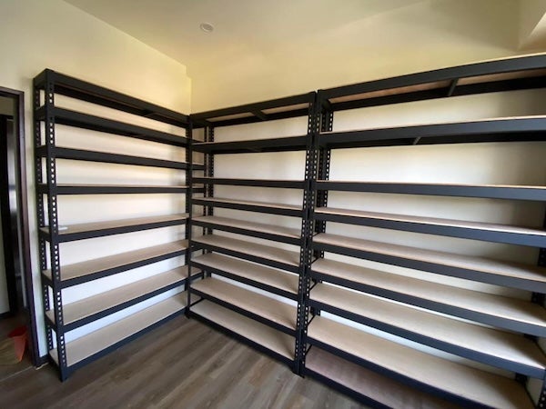 無論是使用系統櫃或是木作櫃,儲藏室內的櫃體材質建議選擇耐重能力最佳的木芯板,或是改用以角鋼為主要結構的收納架,避免長時間存放重物導致層板下凹變形。