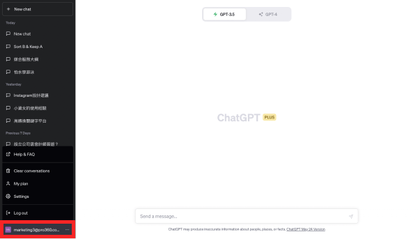 1.若您是ChatGPT Plus的會員,首先需登入ChatGPT,並開啟帳號選單,點選「Settings」。