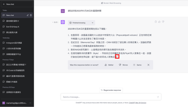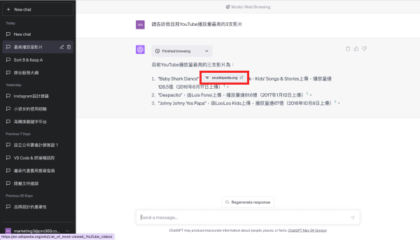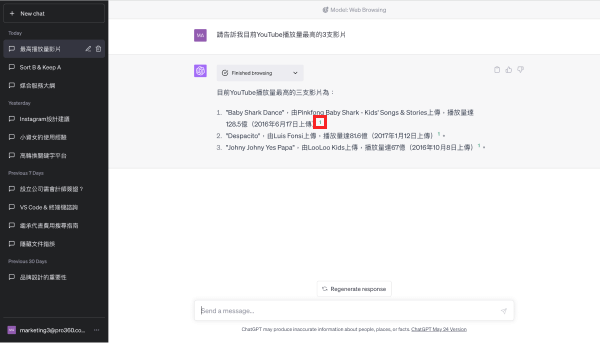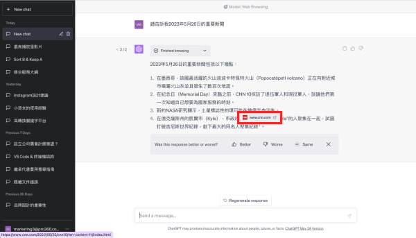 4.下面舉幾個簡單的例子來進行連網實測,在這裡我們向ChatGPT試問2個問題:「請告訴我2023年5月26日的重要新聞」,以及「請告訴我目前YouTube播放量最高的3支影片」,並且您可以根據回答末尾的綠色數字標記,得知ChatGPT參考的網站連結。