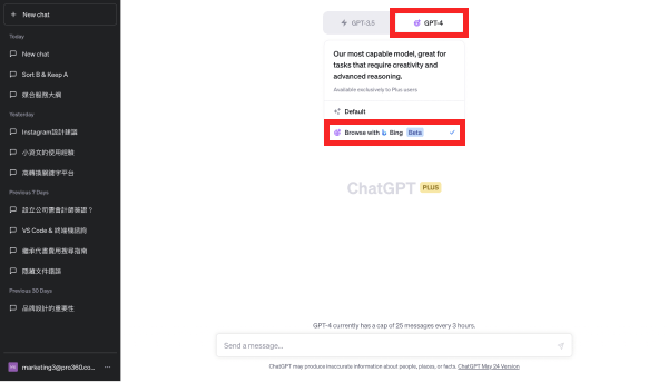 3.回到ChatGPT的首頁,選擇使用GPT-4語言模型,並於下拉的選單中選擇「Browse with Bing 」,即可讓ChatGPT連接網路,但通常須耗時約1-2分鐘,等待ChatGPT整理網頁搜尋的結果。
