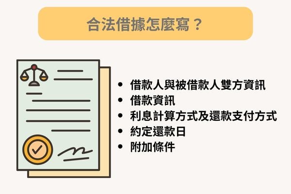 合法的借據範本應該包含雙方的真實姓名、身份證字號、住址、簽章以及借款金額、支付方式、利息計算方法、還款期限,若有擔保物或連帶保證人亦需明確說明,此外,借據應詳載借款日期,若為補簽也必須標註為補簽,才能確保借據的法律效力。