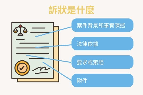 訴狀是在法律程序中提交給法院的正式文件,通常由原告(或聲請人)起草,其中包含對被告(或被申訴人)提出的指控、索賠或要求,書狀內容通常包括下列各款事項: