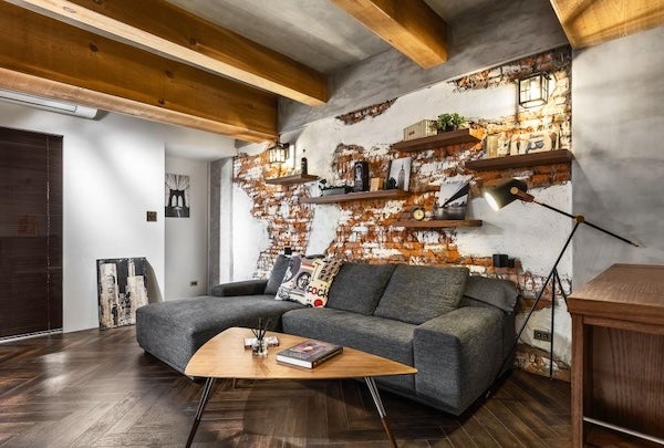 設計師在此案例中以斑駁的牆面設計手法搭配木質橫梁與復古燈飾,使空間散發濃厚的歷史韻味;灰色系的布沙發與深色木地板相呼應,更進一步加強了空間的深度與質感;牆上懸掛的藝術品與擺飾充分展現屋主的個性與藝術品味,使整個空間散發獨特而迷人的復古氣息,同時兼具藝術性與舒適感,成為兼具視覺與居住享受的完美居所。
