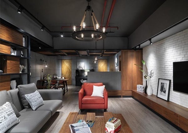 這個案例中,Vicky設計師採用暖色木質元素和灰階配色,使整個空間顯得格外溫暖舒適。天花板採用明管設計並將管線漆上紅色油漆,呈現出對比鮮明的工業風氛圍;皮革沙發與金屬吊燈營造現代感,透過細膩的裝飾擺設,凸顯空間的個性與質感,打造出兼具溫馨與工業風格的理想居所。