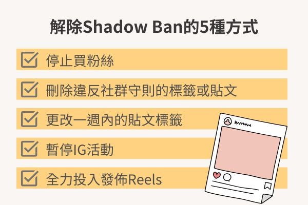 由於IG並不會告知用戶帳號受到限制,許多用戶直到貼文按讚數明顯減少,或是點擊Hashtag也看不到自己的貼文,才發現自己可能遭到Shadow Ban。由於Shadow Ban並沒有明確的持續時間,建議您若遇到Shadow Ban,可嘗試透過以下5種方式解決: