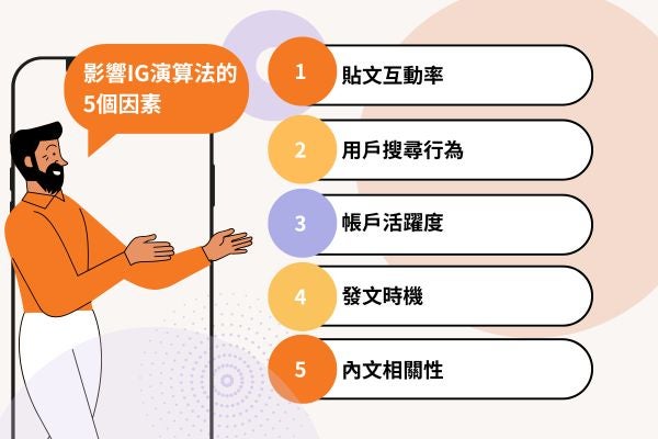 根據前述的演算法介紹可得知,貼文互動率、內容相關性、用戶行為...等因素都會影響IG演算法,品牌及個人創作者應掌握這些影響演算法的因素,才能做出正確的貼文創作及經營策略決策,成功提升貼文觸及率及品牌能見度,以下將為您介紹5個影響Instagram演算法的因素: