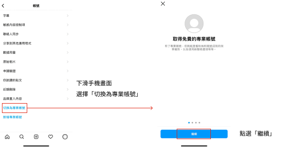 6.畫面下滑選擇「切換為專業帳號」,會有簡單的專業帳號介紹,點選「繼續」後會再進到下一個設定。