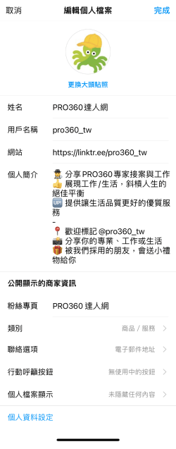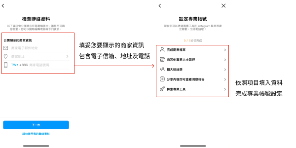 8.選定完成後即開通專業帳號功能,您可以輸入完整的聯絡資料以及商業檔案,使觸及用戶更加了解您的品牌或專業,以達到利用社群媒體行銷品牌的目的。