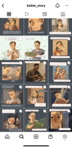 圖文插畫家「李白」主打鮮明的繪畫風格及獨特的「街頭故事」,在IG上擁有17.3萬粉絲追蹤,李白經營IG的貼文內容主要是分享每個似顏繪客人的故事,而後期也有一些業配合作和小漫畫,而這些內容則主要以「底色」及「邊框」做排版,分享單張圖畫時以相同的底色搭配相似的格線、文字格式排版。