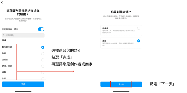7.選擇與您的品牌或店家相符的類別後點選「完成」,再選擇創作者或商家,商家的功能較完整,但若您經營IG是發布個人創作內容,例如:繪畫分享、設計分享或是攝影作品集...等,可以選定創作者即可。