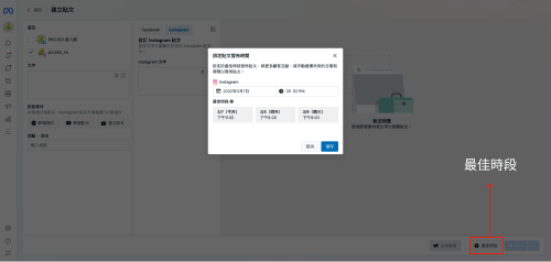 在最多粉絲上線的時間發文能夠觸及到最多用戶,等同您的貼文有越高的機會被看見,因此最多粉絲使用Instagram的時間就是您的最佳貼文發布時間,您可以藉由Facebook後台發布貼文,選擇以Instagram發布,即可在右下角的「最佳時段」查看您有最多粉絲上線的時段。