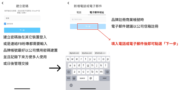 2.用戶名稱選定後需要建立密碼,日後在不同裝置登入或是連結臉書粉專時都需要輸入密碼,密碼建置完成則要輸入電話號碼或電子信箱,除了Instagram官方需認證使用者外,也是忘記密碼時Instagram官方寄送重設信件的管道。