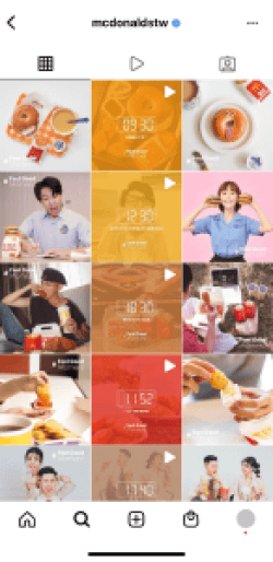 麥當勞品牌形象主打歡樂活力,因此版面也是選擇明亮的色調作為主視覺,為強調一天24小時都可以輕鬆享用麥當勞,更在三格三格的貼文版面中心放入以電子時間為主的貼文,將每個時段的美味透過IG貼文深植粉絲的心中。
