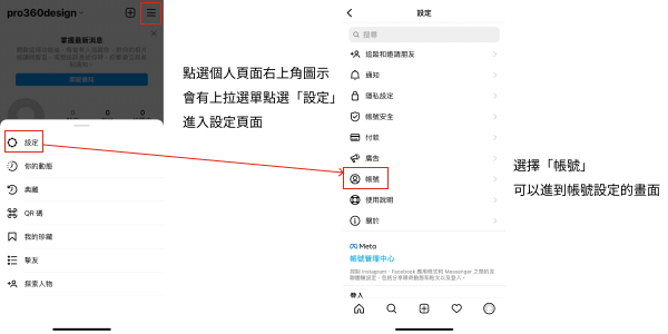 5.完成帳號註冊後即可將帳號切換為專業帳號,點選個人頁面右上角圖示後選擇選單中的「設定」進入設定功能頁面,點選「帳號」進入帳號相關設定。