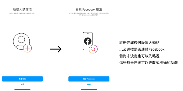 3.為帳號設置大頭貼或是連結FB帳號讓原本的粉絲或是好友收到您已註冊IG帳號的通知,Instagram也會自動為您的IG帳號追蹤FB原先的好友或是追蹤名單。