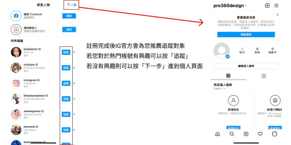 4.追蹤有興趣的熱門帳號或直接進到個人頁面,當您完成基本的帳號註冊後IG官方會推薦您Instagram的熱門帳號,這些帳號是在IG上擁有大量粉絲的明星、藝人或是官方帳號,您可以追蹤這些擁有大批粉絲的帳號,觀察多數人對什麼樣的內容感興趣,或是追蹤IG官方帳號接收所有最新資訊。