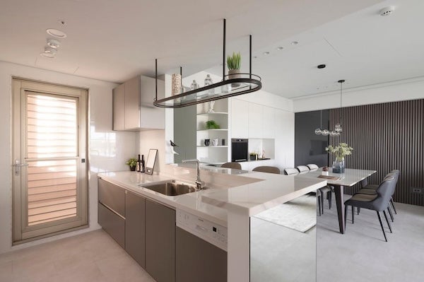 若家中坪數較小,設計中島電器櫃時可以採用雙向收納的設計樣式,讓使用者在廚房內側或客餐廳都能靈活使用家電與儲存空間,不僅能讓使用動線更順暢,還能提升中島電器櫃的使用效率。