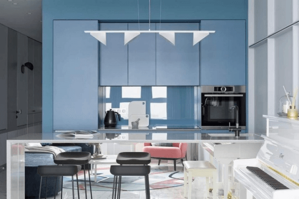 可以,藍色能營造平靜療癒的氛圍,且有多種搭配方式,從明亮活潑到沉穩奢華皆可。淺藍色適合小廚房,能讓空間感覺更開闊,而深藍色則能為大空間帶來穩重感。但需注意若有風水考量,則有不同的觀點:部分說法認為藍色屬水,恐克滅爐灶之火,建議避免;另一說法是淺藍色可稍稍洩火,但需謹慎使用,因此若想在廚房選用藍色,最保險的選擇是淺色系。