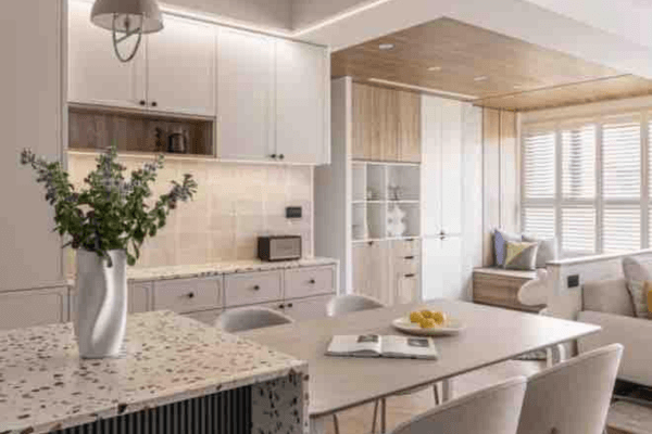 建議選擇米白、奶茶色、灰綠或暖灰...等低飽和的中性色或柔和暖色調,不僅耐髒好清理,也能讓廚房更明亮溫馨,長時間下來仍保有舒適感與生活氣息。