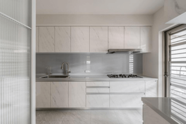 白色系廚房以明亮、潔淨為主要特色,白色櫥櫃與牆面一體成形,能放大視覺空間,適合小坪數廚房。另外,白色容易凸顯油煙,建議使用易清潔的半光或亮光漆面,並以溫和清潔劑定期擦拭。