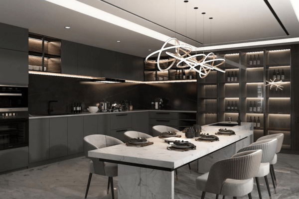 黑色系廚房多以深黑牆面搭配金屬燈具與櫥櫃,是高質感與個性鮮明的奢華氛圍代表。黑色在視覺上具有收斂的效果,適合大坪數或開放式廚房,但黑色易使空間黯淡,應搭配充足照明,避免光線不足或過於壓抑,並建議使用半光或霧面漆,讓清潔更容易、耐髒表現更佳。
