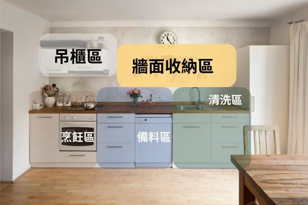 將廚房內所有可收納的空間根據依照烹飪流程劃分,例如:備料區、烹煮區、清洗區、餐具櫃、電器櫃…等,並紀錄該區域應該使用或收納的物品,讓每個區域所需的物品集中收納,減少來回取放的時間,不僅可改善廚房動線,也能提升烹飪效率。