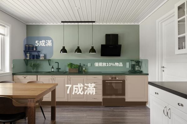- 流理檯、餐邊櫃、電器櫃的開放式展示檯面僅擺放1成的物品