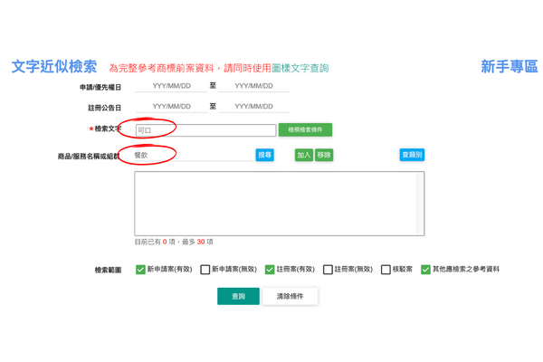 - 首先進入經濟部智慧財產局商標檢索系統,並輸入查詢的商標名稱及商標註冊類別。