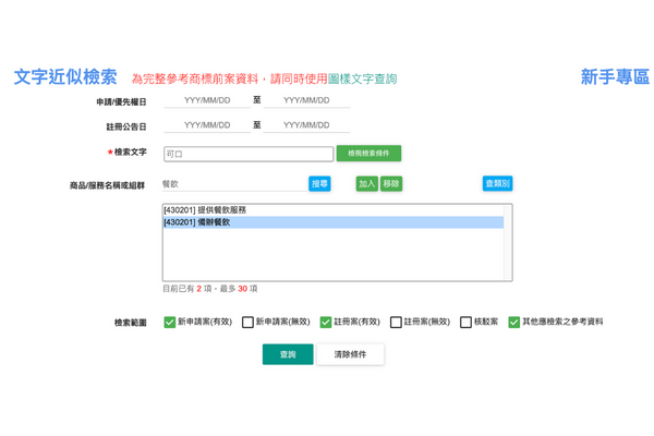 - 商標查詢檢索:透過商標查詢系統確認是否相似商標存在,避免造成商標侵權,同時提高商標註冊成功機率。