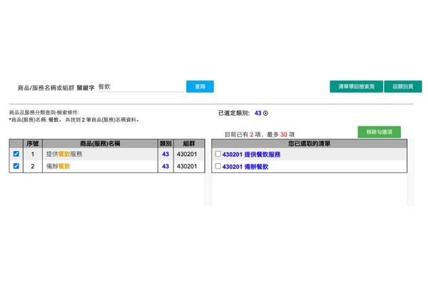 - 回到檢索頁面,便可看到勾選商品及服務清單已帶入欄位,此時只要按下查詢即可。