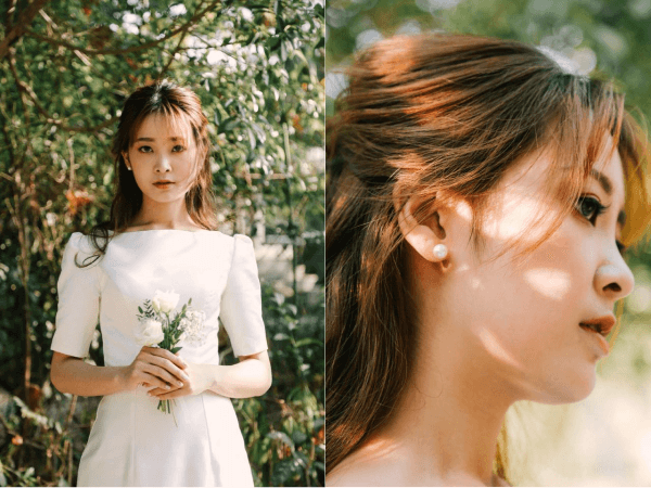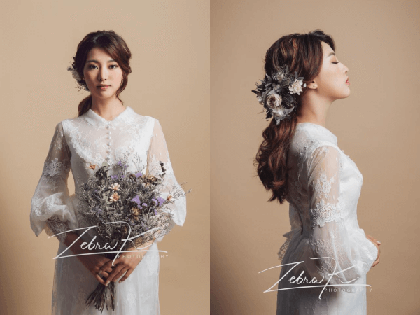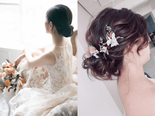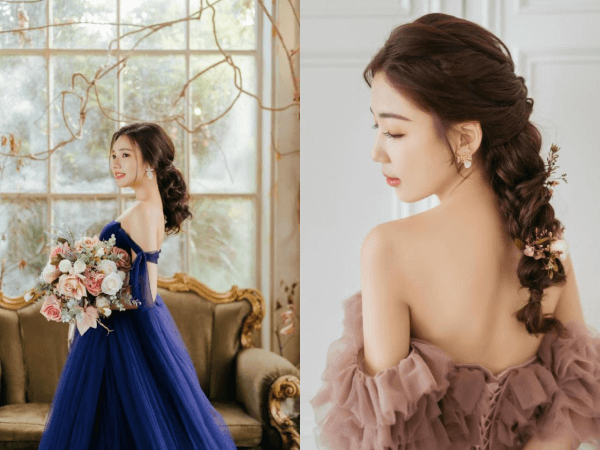韓式婚紗髮型則通常採用自然的鬆髮造型、低馬尾、中低盤髮...等,會盡量並避免過於複雜的設計,以簡約和優雅為主要特色。如果您想要增添些許變化,您也可以採用編髮的方式來增添層次感,展現柔美的女性魅力;或者,女孩們也可以選擇一些造型簡單但優雅的配飾,進一步塑造出質感名媛風。