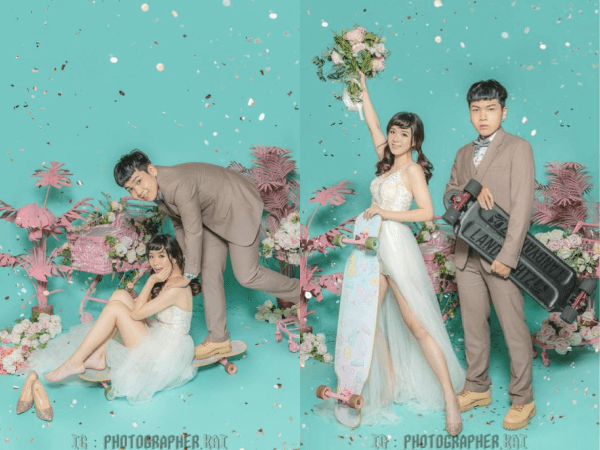 韓風婚紗照多在攝影工作室進行拍攝,較少外拍場景,而在棚景的選擇上,承襲韓系婚紗照一貫的風格,多為自然、簡約感的棚景,較經典的場景例如:充滿植物、花藝元素的自然風格佈景,或是自然溫馨風格的生活感場景,此外,韓式婚紗照亦常常使用素面的白牆進行拍攝,簡單低調地襯托作為主角的新人,若您喜歡較活潑的風格,亦可以選擇明亮色系的素色背景進行棚內拍攝。