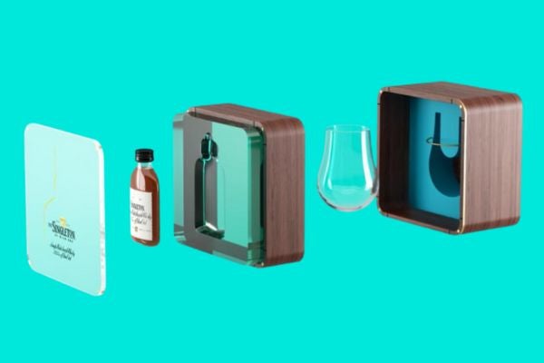 Z CONSULTING LAB所設計的威士忌包裝禮盒,考量玻璃易碎的特性,採用泡棉及塑膠作為禮盒內襯,塑膠內襯可固定瓶身,避免運輸途中的晃動造成酒瓶破損,並透過泡棉內襯為玻璃杯提供緩衝,有效提高產品保護力。