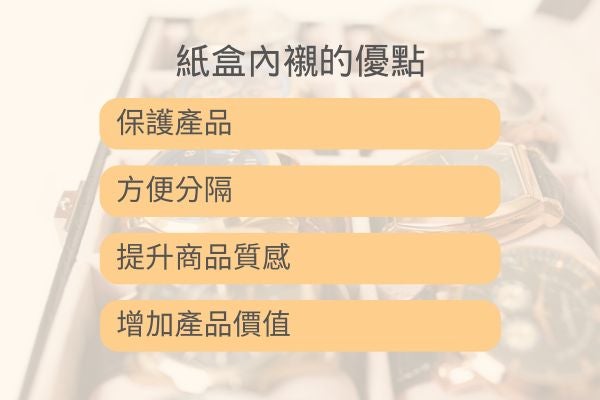 紙盒內襯為放在盒內的襯墊,通常用於保護產品及增加包裝質感,以下將為您詳細說明內襯的功能: