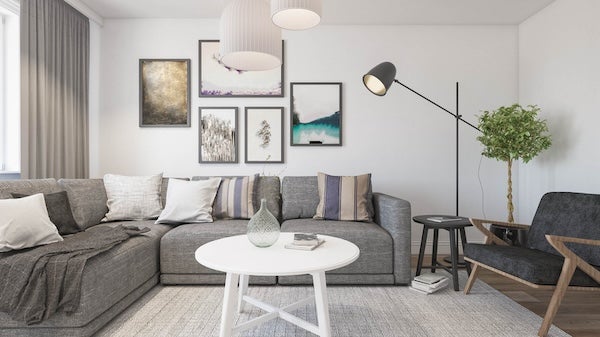客廳掛畫的高度建議與成人視野平行或是距離地面150~160公分,以達到最佳的觀賞效果;若是懸掛於沙發背牆,建議距離椅背頂端15~30公分,避免頭部碰撞掛畫。