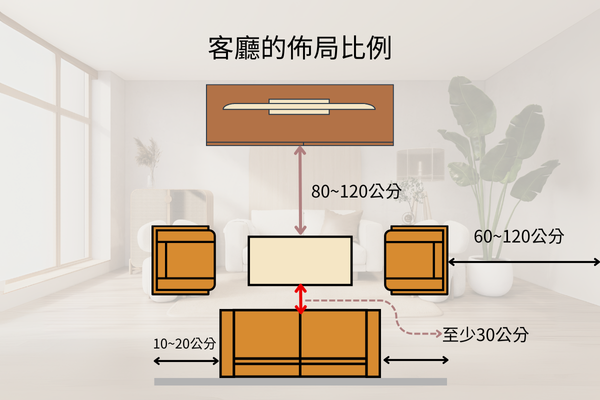 客廳中每件家具的尺寸與擺放距離都需要妥善規劃,不僅能讓客廳空間更順暢、提升方便性,還能讓客廳的視覺比例更和諧,以下整理客廳的佈局比例建議供您參考: