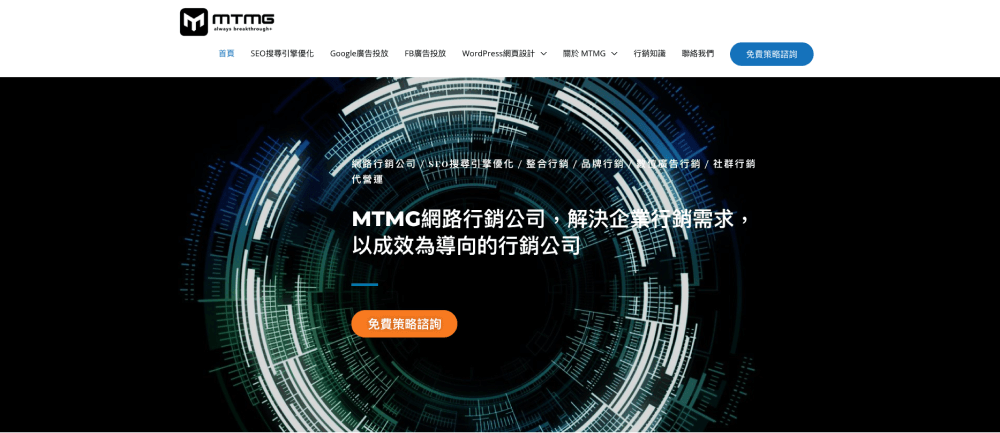 MTMG 網路行銷公司提供的服務包括:SEO搜尋引擎優化、Google關鍵字廣告投放、網路行銷、FB廣告行銷、數位行銷、社群行銷、品牌行銷、內容行銷、數據分析、網站製作以及文案撰寫、Banner設計、銷售頁漏斗設計等專業領域的服務。