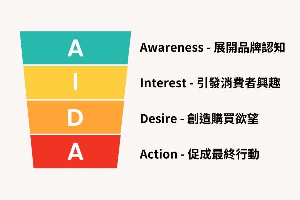 AIDA行銷漏斗是最早的行銷漏斗模型,說明行銷人員如何引導潛在客戶完成特定動作,實現行銷目標的過程,其中包含認知(Awareness )、興趣(Interest)、慾望(Desire)及行動(Action)四個階段,隨著顧客逐步從漏斗頂端向下移動,企業可以利用漏斗每一階段的數據優化行銷策略,從而提高顧客購買的機率,以下將為您詳細說明AIDA模型的四個階段: