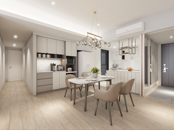 現代住宅空間有限,廚房經常與客廳或餐廳緊密相連,建議可採用開放式廚房設計,將廚房與客廳、餐廳整合成公共空間,不僅能增加整體空間的通透感,還能使家人間的互動更頻繁,若想要區隔開放式廚房與客廳,可以擺放廚房中島或是規劃吧台區,供家人朋友聚會交流。