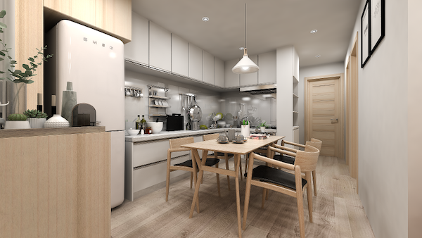 設計小廚房時建議使用白色、米色、淺灰色…等淺色系作為主色調,讓整體廚房空間更明亮寬敞,若您擔心設計過於單調,可以在櫥櫃門片、牆面與地板上加入跳色設計,提升空間的層次感。