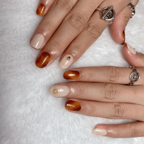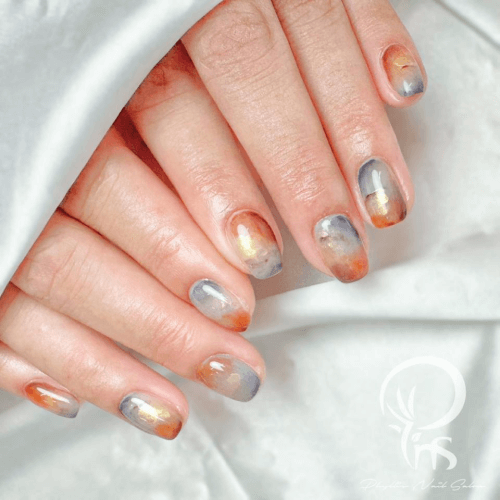▼寶石暈染也是美甲界相當受歡迎的款式,您可以利用運染技術創造各種寶石般的特殊色澤,秋冬經典不敗的琥珀美甲(左圖)便是屬於此類。