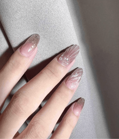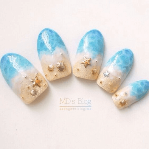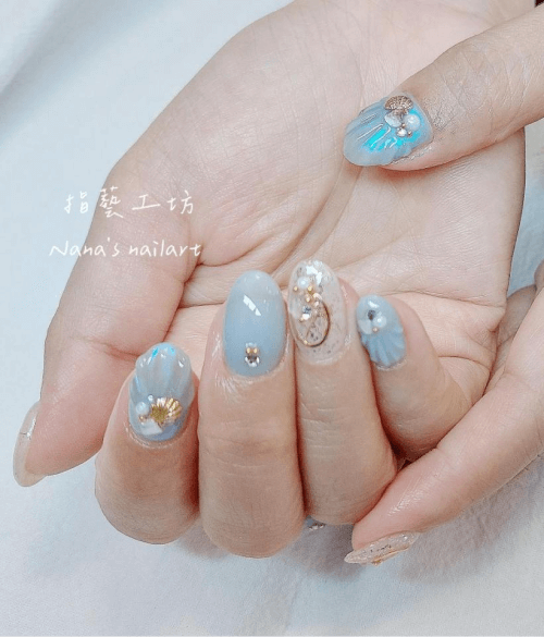 夏季美甲款式絕不能錯過夢幻又仙氣的人魚系美甲!人魚風美甲大量運用藍色、綠色、紫色、粉色系指甲油,搭配貝殼紋路、珍珠、海星、亮片...等元素,營造濃厚的海洋氛圍,並透過顏色的漸變,模擬海水深淺不一的視覺效果,增添夢幻感。