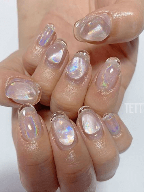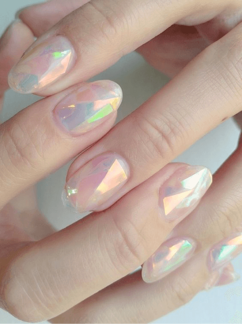 冰塊美甲是近期非常流行的美甲款式,通常以透明、裸色、淺粉色系的凝膠作為基底,塗上鏡面指彩粉後再貼上玻璃紙,營造冰塊折射後的透亮感,相當適合夏天。
