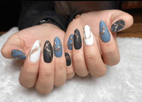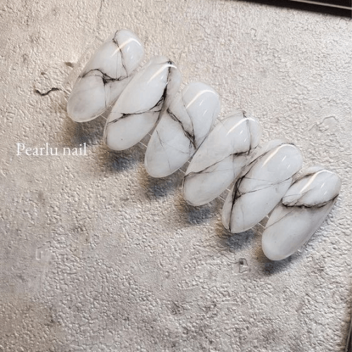 大理石美甲屬於暈染技術的一種,在製造暈染效果時,會刻意做出彷彿大理石紋理般的明顯紋路,除了經典的黑、白、灰風格,亦可以搭配其他色系的指甲油,創造不同風格。