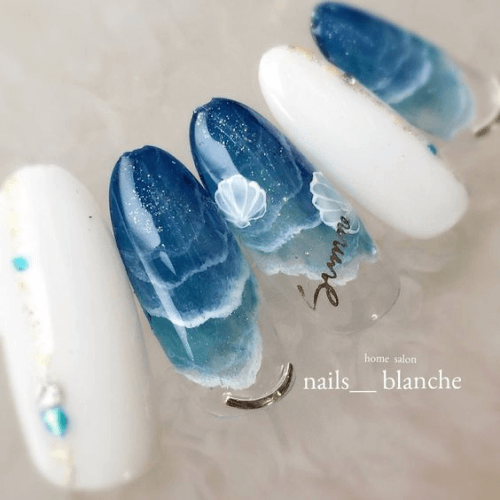 ▼炎炎夏日,不妨做一款讓人聯想到蔚藍大海的特殊美甲吧!暈染也可以繪製海浪般的效果,您可以利用藍、黃搭配,創造沙灘與海洋的意象,也可以利用藍色與白色繪製滾滾浪花。